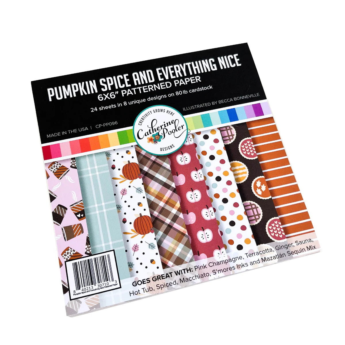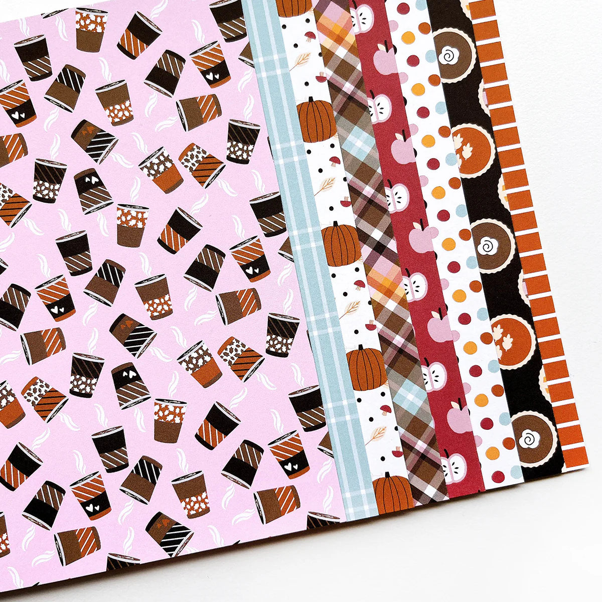 The Pumpkin Spice and Everything Nice Patterned Paper Pack features hot coffees, pumpkins, pies and leaves.