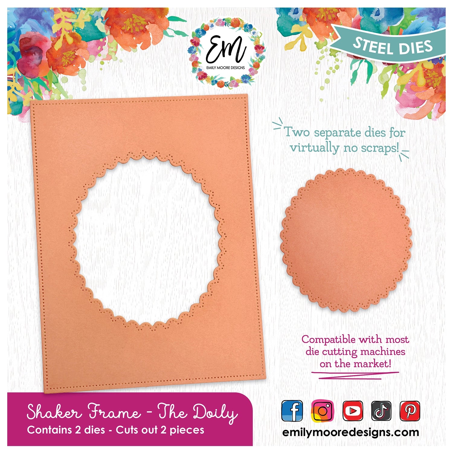 Give your handmade cards extra sparkle and dimension with The Doily Shaker Die Set from Emily Moore Designs. This two-piece die set creates a charming A2-sized card panel with a perfectly placed decorative oval window, ideal for sequins, confetti, or tiny embellishments (all sold separately). With elegant stitched edging and a detailed doily-style design, it's perfect for birthdays, everyday greetings, and cheerful notes that shake things up!