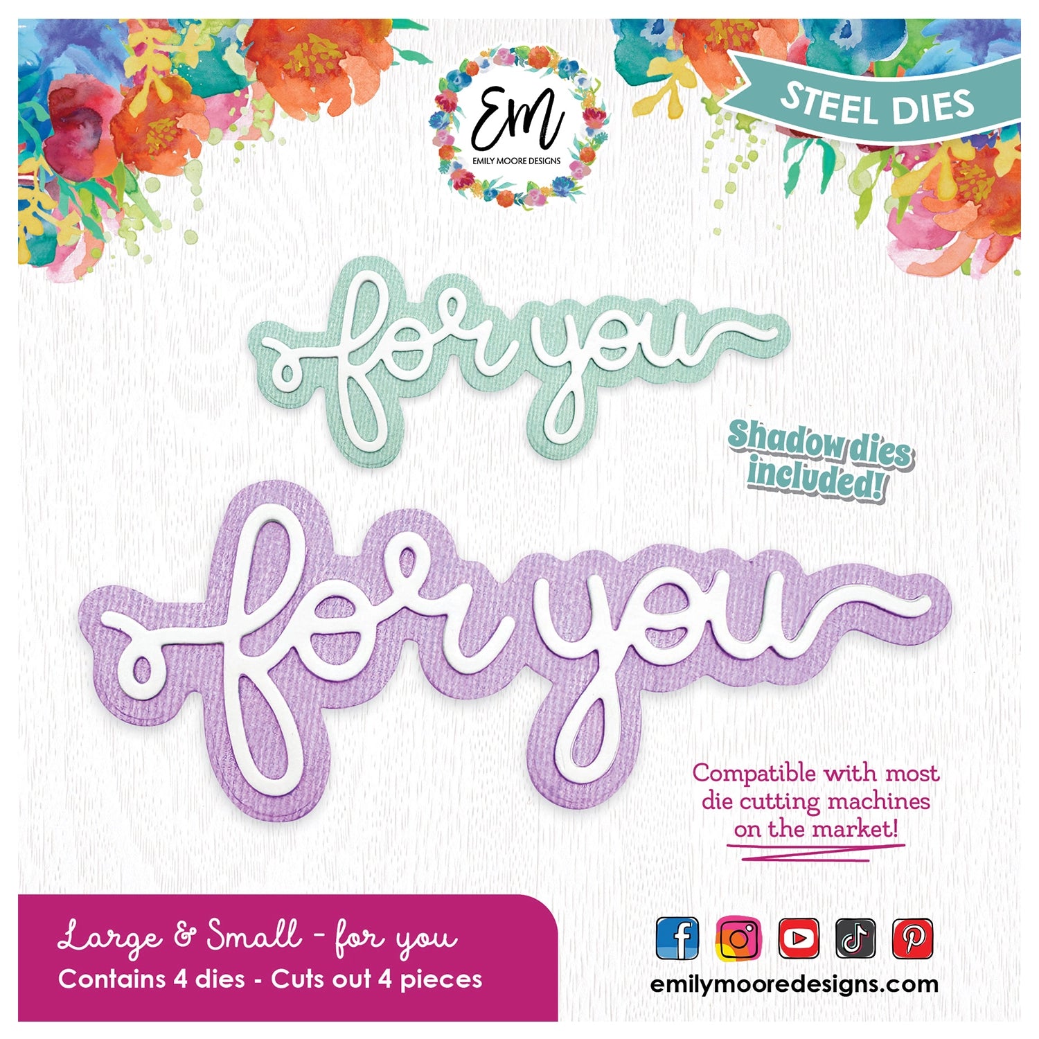 Add a personal touch to your cards, gift tags, and paper projects with the For You Word Dies from Emily Moore Designs. This 4-piece steel die set includes “for you” in delicate script, accompanied by coordinating shadow dies for added depth and elegance.