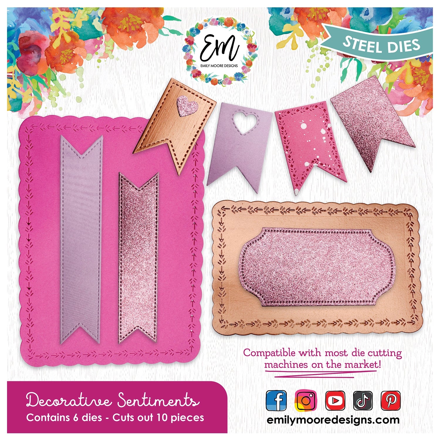Give your handmade cards and scrapbook layouts the perfect finishing touch with the Decorative Sentiment Dies from Emily Moore Designs. This elegant 6-piece set features stitched banners, frames, and decorative shapes with unique embossed borders, ideal for showcasing heartfelt sentiments or layering behind die cuts and embellishments.