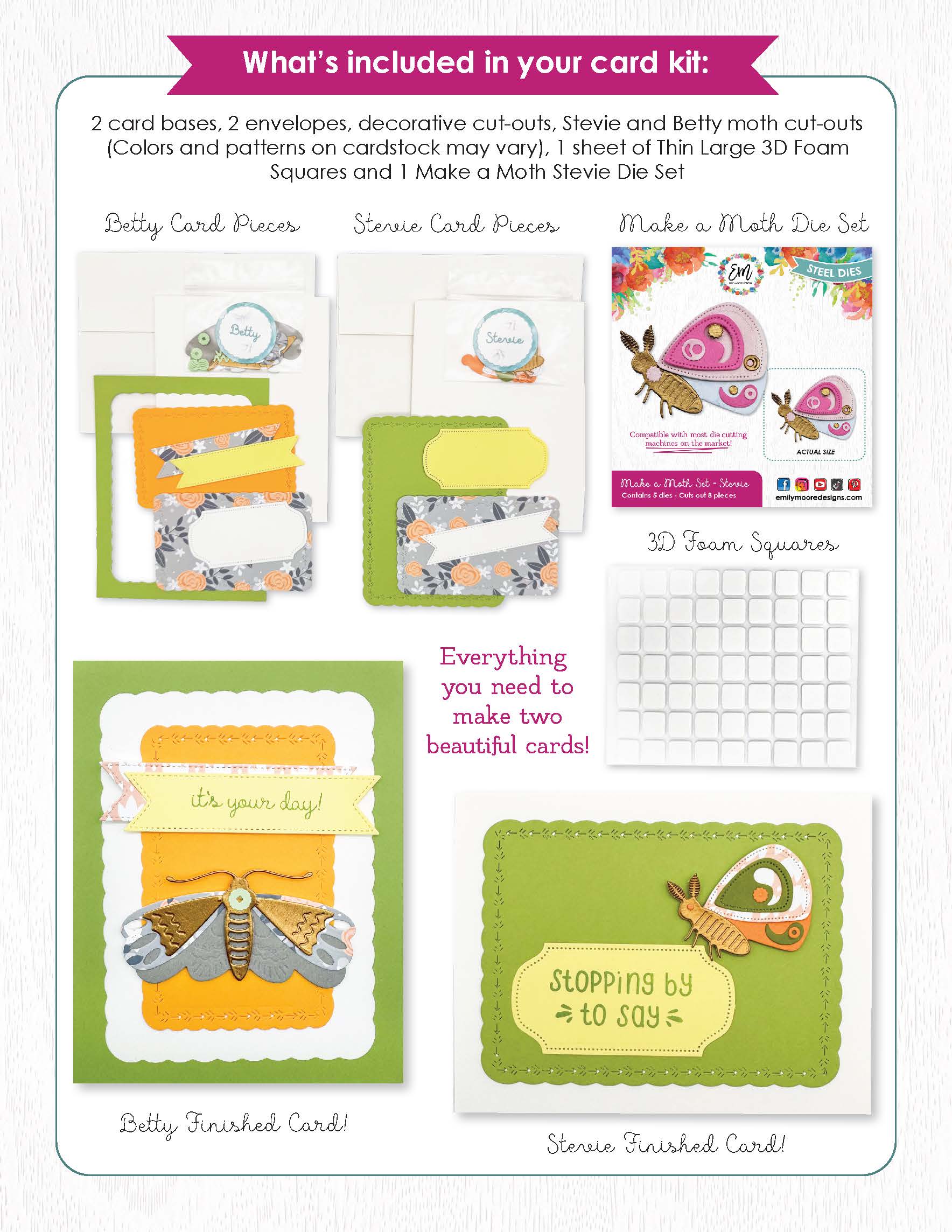 This kit also includes one of our newest releases, Make A Moth – Stevie, plus a full sheet of adhesives to make crafting easy from start to finish. Discover the intricate details and stunning dimension our moths add to handmade cards.